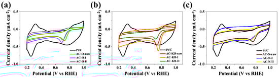 CV curves of the (a) AC–O; (b) AC–KB; (c) AC–N compared with Pt/C catalysts in an O2-saturated 0.1 M KOH solution.