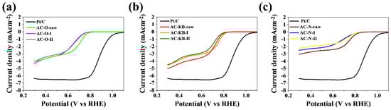 LSV curves of the (a) AC–O; (b) AC–KB; (c) AC–N compared with Pt/C catalysts, at a scan rate of 5 mV s−1 and a rotation rate of 1600 rpm in O2-saturated alkaline media.