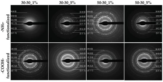 The SAED patterns for the 1 and 5% -NH2-/-COOH-functionalized MNPs.