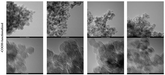 Moreover, the nanoparticles were subjected to TEM and HR-TEM analysis in order to determine the morphology and the size of the nanoparticles (Figure 4). TEM and HR-TEM images demonstrate the formation of MNPs characterized by an increased tendency of agglomeration, due to the considerably reduced particle size. However, it can be observed that while the -NH2-functionalized nanoparticles are uniform and quasi-spherical, the addition of the -COOH functionalization agent also led to the formation of polyhedral nanoparticles, especially at higher flows and concentrations. Thus, it can be assumed that the functionalization agent also plays the role of a surfactant that determines the shape of the nanoparticles. Overall, the growth and coarsening of the nucleation centers and, subsequently, of the magnetite crystals have resulted in the formation of monocrystalline nanoparticles. Additionally, the HR-TEM images confirm both the crystallinity of the nanoparticles through the arrangement of the atomic planes and the presence of the organic component on the surface of the nanoparticles through the thin layer surrounding the magnetic core.