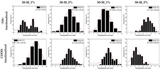 The size distributions (Figure 5) are significantly narrow, with nanoparticle sizes ranging between 2 and 10 nm. Except for the -NH2-functionalized 30-30 sample, all distributions are monomodal, thus demonstrating the efficiency of microfluidic methods for ensuring nanoparticle size uniformity. Moreover, the average nanoparticle size is directly influenced by the presence and type of the functionalization agent and by the flow. Specifically, for the -NH2-functionalized nanoparticles, the average size increases with the concentration of the functionalization agent and the flow. By contrast, higher flows and SBA concentrations lead to decreases in the average size of the -COOH-functionalized nanoparticles. Additionally, since the average nanoparticle size varies between 4.5 and 7.5 nm, it can be concluded that the nanoparticles are monocrystalline.