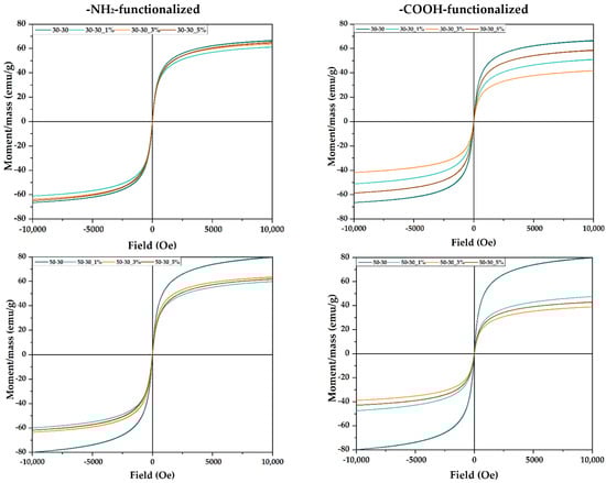 The magnetic properties of the nanoparticles were evaluated by VSM analysis (Figure 7). It can be observed that no sample shows hysteresis, thus confirming the formation of MNPs with superparamagnetic properties. Additionally, for the -NH2-functionalized samples, higher saturation magnetization values of approximately 60 emu/g were obtained, which is due to the larger size of the nanoparticles, according to the TEM analysis. Furthermore, for the 30-30 -NH2-functionalized sample, there are no significant differences between the pristine and the functionalized nanoparticles, which further confirms the low functionalization yield. However, for the other samples, the addition of the functionalization agent leads to a magnetization decrease, especially in the 50-30 -COOH-functionalized sample. Nonetheless, the magnetization values are similar to other studies that investigated MNPs with the same sizes [1,43].