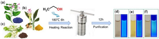 Schematic preparation of C-dots derived from natural plant dyes. (a–c) are the images of natural plants and dyes, corresponding to Indigo, Carcuma longa, and Sophora japonica L., respectively; (d–f) are C-dots solution upon room light (left) and 395 nm light illumination (right). The C-dots solutions were prepared via a heating reaction by using (d) Indigo, (e) Carcuma longa, and (f) Sophora japonica L. as precursors and ethanol as solvent.
