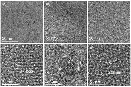 Typical TEM and HR-TEM images of the as-prepared C-dots. (a,d) C-dots derived from Indigo; (b,e) C-dots derived from Carcuma longa; (c,f) C-dots derived from Sophora japonica L.