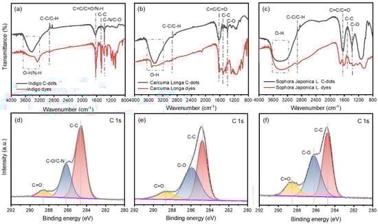 (a–c) are the FT-IR spectra of C-dots and dyes, corresponding to Indigo, Carcuma longa, and Sophora japonica L., respectively; (d–f) are high-resolution XPS C 1 s spectra corresponding to C-dots derived from Indigo (d), Carcuma longa (e), and Sophora japonica L. (f).