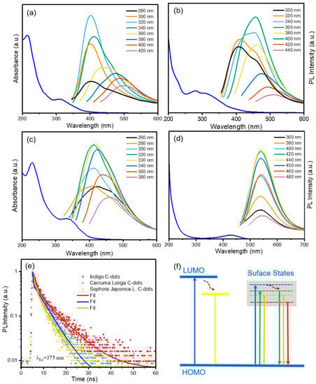 The as-prepared C-dots dispersed in water have a light yellow color under room light. Upon 395 nm illumination, the C-dots aqueous solutions show blue (Indigo), cyan (Carcuma longa), and bluish green (Sophora japonica L.) colors (inset of Figure 1d–f). We also thoroughly examined the optical characteristics of C-dots made from natural dyes, such as their UV-Vis absorption, PL spectra, and transient PL spectra. All of the C-dots exhibit absorption between 220–450 nm, as shown in Figure 4a–c. All C-dots have excitation-dependent PL behaviors. The reason for this phenomenon is inferred to be the presence of surface defects such as oxygen-containing functional groups or nitrogen-containing functional groups in the surface structure of the C-dots [28].