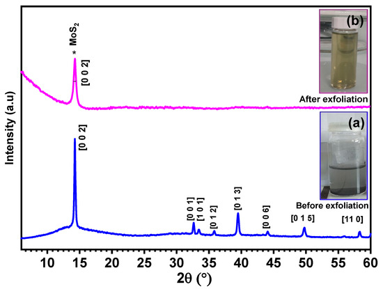 - Ma, H.; Shen, Z.; Ben, S. Understanding the exfoliation and dispersion of MoS2 nanosheets in pure water. J. Colloid Interface Sci. 2018, 517, 204–212. [Google Scholar] [CrossRef]