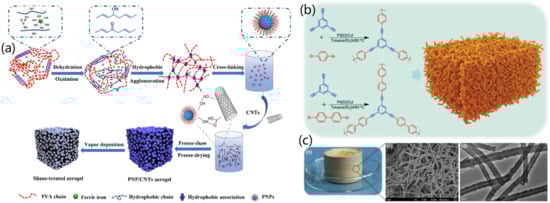 The unique inherent properties of CNTs make them widely used as enhancement components to various composite aerogels, and, meanwhile, their nanoscale structure is perfect for achieving CMBAs with high porosity and interconnected nano-networks. Zhang and co-workers developed a novel synthesis strategy of CNT-based aerogels by combining PVA-based nanoparticles (PNPs) and CNTs [47]. The synthesis process is shown in Figure 4a, where, in the presence of Fe3+ ions, CNTs were introduced into the PVA solution for hydrothermal treatment, and the resulting PNP/CNTs solution was obtained, which could be further treated to PNP/CNTs aerogels through a freeze-drying process. The materials characterizations indicated that PNPs presented a dandelion-like structure, with cross-linked molecular chains as the core and uncross-linked PVA chains as the shell on the PNP surface. In addition, it was found that there were many CNTs on the surface of PNP/CNTs aerogels, which tangled with PNPs to form a composite structure. The unique properties of the synthesized PNP/CNT aerogels, such as good hydrophobicity, high porosity, and interconnected porous structure, revealed great potential for adsorption of organic solvents in environmental science.