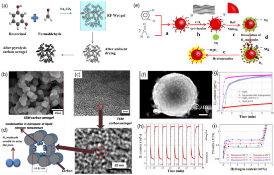 Peng et al. reported the synthesis of shell-core MgH2@CA microspheres for high-performance H2 storage [96]. As indicated in Figure 10e, formaldehyde and resorcinol were mixed together to form RF aerogels after CO2 supercritical drying at room temperature. After high-temperature pyrolysis at Ar flow, CAs with a microsphere structure were synthesized. After that, the ball-milling technique was utilized for the preparation of Mg@CA microspheres, which were further utilized to form MgH2@CA microspheres via a hydrogenation process. The synthesized MgH2@CA microspheres had an average size of 10 µm, in which small MgH2 particles were found to cover the surface of the CA microspheres (Figure 10f). The formed MgH2@CA microspheres revealed enhanced H2 adsorption compared to Mg power, MgH2, and mixed MgH2-CA (Figure 10g), ascribed to strong binding between Mg and H atoms, as well as the inhibited agglomeration by CA microspheres. In addition, the MgH2@CA microspheres exhibited very good cycle stability for the adsorption of H2 and high performance for adsorbing and releasing H2 at different temperatures (Figure 10h,i). This study provides a new strategy for the design and synthesis of functional hydrogen storage materials with good stability and high cycle ability. In a similar study, Utke and co-workers reported the fabrication of CA with 2LiBH4-MgH2 composites, which were then further modified with ZrCl4 for the fabrication of functional CMBAs [97]. After the modification with ZrCl4, the dehydrogenation temperature was decreased and the H2 storage capacity of the designed CMBAs was improved. The obtained results indicated more than 90% H2 storage capacity could be released and reproduced after 4 cycles of testing.