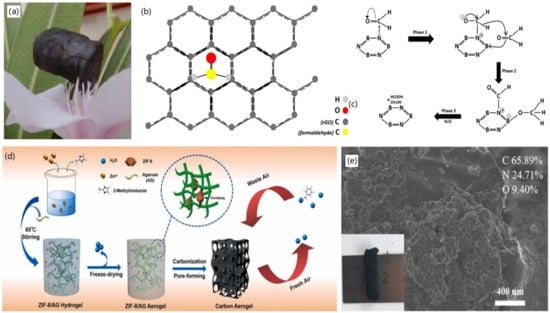 With the development of materials science and nanotechnology, various carbon materials, such as biomass-derived carbon [5], carbon nanotubes (CNTs) [6], polymer-based carbon nanofibers (CNFs) [7], graphene [8], and graphene-like carbides (such as SiC and Ti3C2Tx) [9,10] have been utilized for the fabrication of carbon material-based aerogels (CMBAs). Similar to traditional fabrication techniques of both polymer and inorganic aerogels, CMBAs can also be firstly prepared through the formation of 3D hydrogels., Subsequent drying (like both freeze-drying and room-temperature drying) and thermal reduction or carbonization can then create 3D hydrogels by sol–gel polymerization, hydrothermal reaction, self-assembly, electrospinning, 3D-printing, and templated synthesis [11]. Compared to traditional polymeric, inorganic, and biomass material-based aerogels, CMBAs have revealed the advantages of higher thermal stability and electric conductivity, as well as higher surface area, lower density, and more actives sites, enabling CMBAs to be excellent candidates for the fabrication of multifunctional materials in various applications, including electrochemical batteries, supercapacitors, wearable devices, electromagnetic interference shields, thermal insulators, and environmental adsorbents. For instance, Wang et al. reported the modification of ZIF-8 with the biomass, agarose, as carbon resource for the fabrication of CMBAs via pyrolysis [12]. The formed CMBAs exhibited 3D porous structure and high potential for the adsorption of organic pollutants. Huang et al. demonstrated the synthesis of 3D graphene aerogels (GAs) with cellular structure, which could be effectively used for the adsorption of electromagnetic waves [13]. Zhang and co-workers presented the preparation of neat 3D C3N4 aerogels through room-temperature polymerization, which exhibited high thermal stability and photo-reactivity [14].