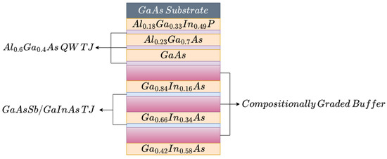 In terms of its characteristics, the cell described in [5] is a six-layer inverse metamorphic device, as depicted in Figure 1. It has the first two junctions’ lattices matched to GaAs, and the rest are increasingly mismatched [5]. In a metamorphic optical device such as this, the addition of a CGB between the mismatched layers is required to smooth the transition from one layer to the next. Further, present in the junctions are the so called Tunnel Junction (TJ), tasked with passing current between adjacent junctions with minimal losses.