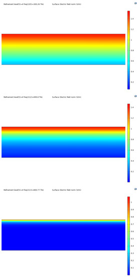 Electric field norm for different frequencies for , at 300 THz, 500 THz and 800 THz.