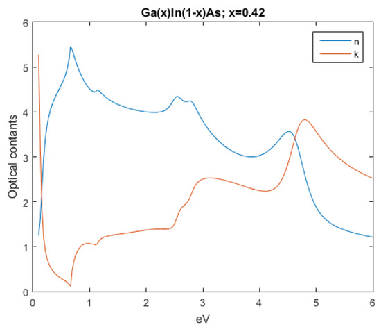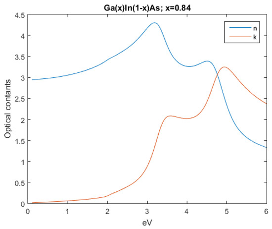 Following the data provided in [22], it was possible to describe the responses of and . For and however, an approximation was needed, as even though the parameter models present in [22] had composition dependence, the interval in which they were valid was too narrow to include these; therefore, a linear approximation of the parameter values was considered with GaAs and at extremities.