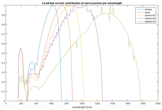 With respect to the behaviour analysis of the multi-junction PV device, a viable optoelectronic basis model was developed. This is particularly visible in the results shown in Figure 10, where the current contributions of each layer are clearly defined with consecutive peaks, a definite characteristic of the device. Another important aspect was the field interaction with the layers, as each displayed a characteristic absorption profile, with clear frequency boundaries, which is tied with their intended placement in the device.