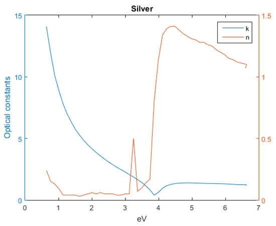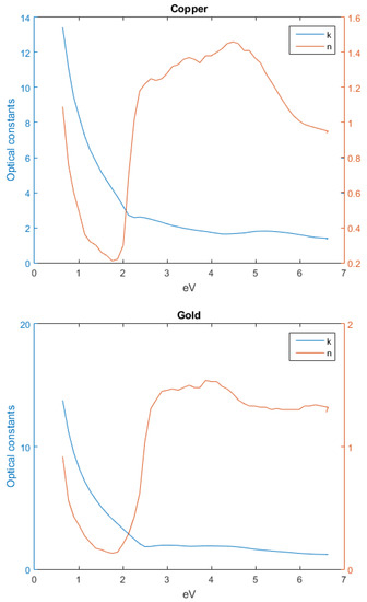An initial assessment of the optical characteristics of gold, silver and copper were performed, in Figure 12, highlighting the influence of n and k parameters, with respect to frequency [24].