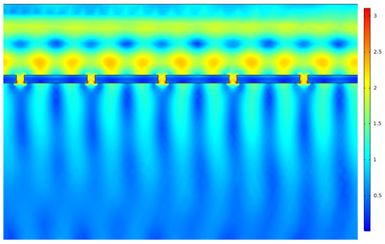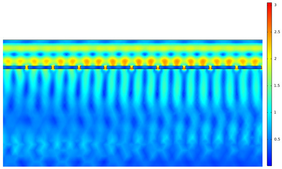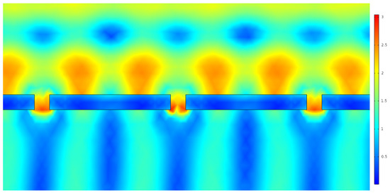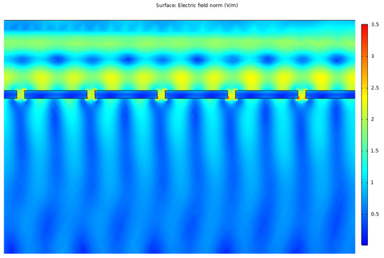 Figure 13 depicts the GaAs absorber layer, with a copper nanoantenna array. Given that the cell was irradiated with an incident electrical field of unitary norm, the values displayed in the heat map indicate the presence of higher intensity fields. These can be explained with surface plasmons, and with them the extraordinary optical transmission effect. As the cell is irradiated, the photons interact with the valence electrons of the metal, creating plasmons; these plasma oscillations propagate in the surface of the metal and, when coupled with the photons, generate surface plasmon polaritons. These, in turn, due to the shape of the nanoantenna are spacially confined to a specific region, where the field intensity is greater than the incident one, due to these oscillatory phenomena. This spacial field confinement, in aperture nanoantennas, occurs primarily within the aperture, as is made evident in Figure 14.