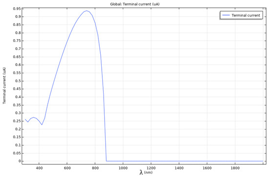 Figure 17 displays the measured terminal current across the frequency spectrum, from = 300 to = 2000 , or from ultraviolet to far into infrared. The current measured at the terminals displays a peak at approximately = 740 , and an initial no-response zone, the latter being due to the bandgap energy of the semiconductor.