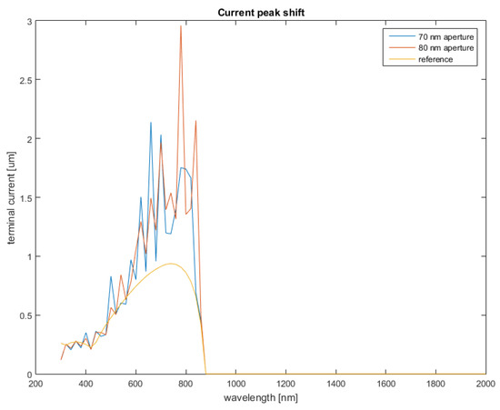Figure 18 displays the reference current profile, on which two additional profiles were overlaid, corresponding to two different aperture sizes. In the case of the 70 aperture gap, the peak current is obtained when the wavelength is approximately = 660 , and in the case of 80 , the peak current is obtained at a wavelength of approximately = 790 . Given the reference peak at = 740 , both results represent a significant shift in frequency, corresponding to a blue shift and a red shift, respectively.