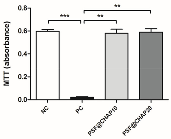 Figure 4. Cytotoxicity evaluation. Absorbance values of NIH-3T3 cells indirectly cultured with either PSF@CHAP10 or PSF@CHAP20 sponges, compared to cells cultured in fresh medium (negative control, NC) and in medium containing 0.1% TritonX-100 (positive control, PC). Data are reported as absorbance values; ** p < 0.01 and *** p < 0.001.