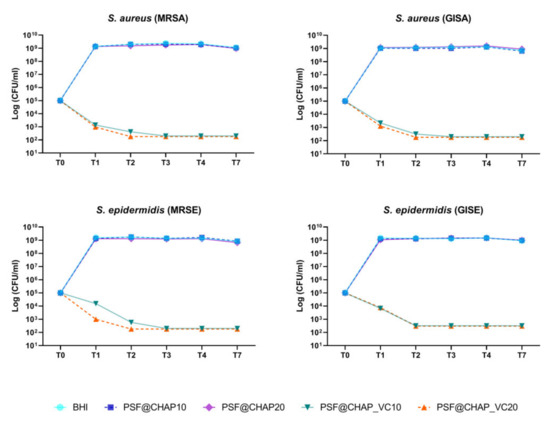 Since a 3-log decrease in the number of CFU per mL, compared to the initial inoculum, was detected over time, PSF@CHAP_VC10 and PSF@CHAP_VC20 can be defined as bactericidal under the current experimental conditions.