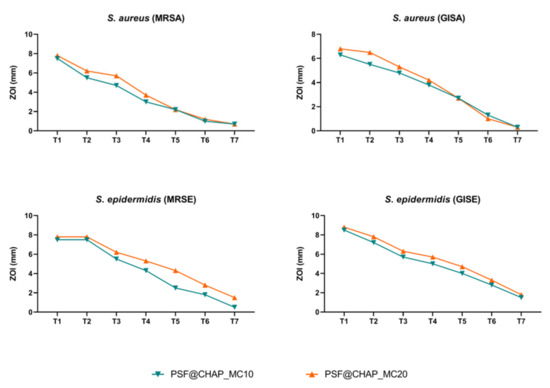 All the staphylococcal strains tested showed a constant decrease in ZOI over time. In particular, PSF@CHAP_VC20 was responsible for the larger (but not statistically significant) halos that were free of bacteria, compared to PSF@CHAP_VC10 (Figure 7).