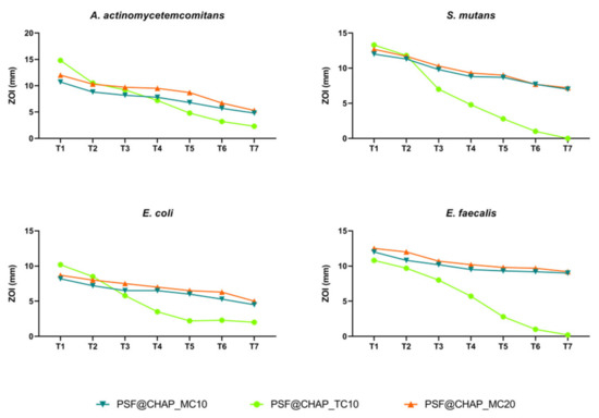 Figure 8. Zone of inhibition (ZOI) of A. actinomycetemcomitans, S. mutans, E. coli and E. faecalis exposed to PSF@CHAP_MC10, PSF@CHAP_MC20 and PSF@CHAP_TC10 sponges over time. ZOIs are reported as mm ± SD and are plotted against time (T0 to T7).
