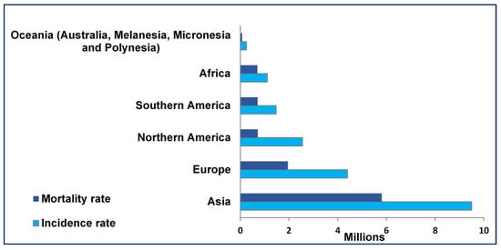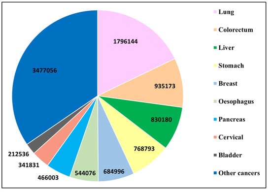 Cancer is a significant cause of death worldwide, with a global incidence and mortality rate of 19.3 million and 9.6 million per year, respectively (Figure 1). Lung, colorectum, liver, stomach, breast, cervical, and bladder cancer account for more than half of the annual deaths (Figure 2) [20]. By 2017, the global cancer motility rate had almost doubled that seen in 1990 [21]. Cancer is a multi-factorial disease induced by multistage carcinogenesis involving genetic, cellular, and epigenetic abnormalities that transform healthy cells into malignant ones [6]. The evolution of cells to their cancerous state is induced by mutational damage to cancer susceptibility genes such as the tumor suppressor, DNA repair, and proto-oncogenes [22].