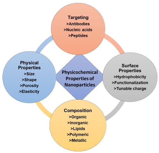 Nanomedicine is a rapidly evolving field of biotechnology. The core concept of nanotechnology dates to 1959, when Feynman demonstrated the ability of NPs to aid in the detection and pharmaceutical treatment of various human ailments [36]. The scientific understanding of the principles governing the interaction of matter with biological systems at the nanoscopic scale has advanced dramatically during the last three decades [37]. Nanomedicine utilizes nanomaterials (1–100 nm) for various biomedical applications, including tissue engineering, therapy, imaging, and diagnostics [31]. The therapeutic effect of nanomaterials is strongly influenced by their surface properties (hydrophilic-to-hydrophobic ratio and charge), physical characteristics (shape and size), and functionalization [38]. Figure 4 provides a general illustration of the favorable physicochemical properties of NPs. Carbon nanostructures, inorganic NPs (e.g., gold, silver, and selenium), lipids (e.g., liposomes), dendrimers, mesoporous silica, magnetic NPs, and polymeric NPs are among the NPs used in nanomedicine [4], with inorganic metal NPs yet to be fully explored [39].