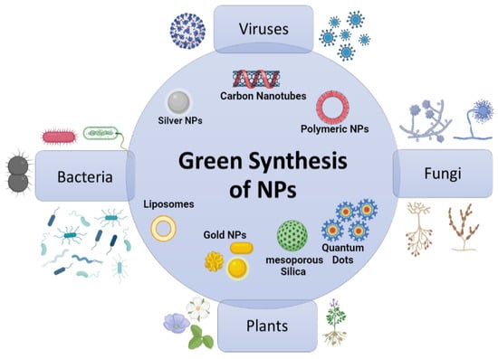 Green synthesis can be defined as the use of various biological or bioactive agents such as plant extracts, microorganisms, fungi, and even biowastes to effectively synthesize metallic NPs in an eco-friendly and bio-reductive manner (Figure 6) [56,57]. Green synthesis vaunts a mechanism of reducing NPs while utilizing relatively low energy and maintaining a cost-effective method [58,59]. This approach, which was initially brought about due to the urgent need for “sustainable development”, requires three fundamental aspects for its success: a non-toxic reducing agent, a solvent of an environmentally friendly nature (for example, ethanol, water, and their combinations), and finally a stabilizer [60,61]. Furthermore, green synthesis offers a biocompatible, environmentally friendly, and non-toxic approach, as the byproducts and capping agents are natural to the environment, which is highly beneficial in the medical sector [56]. These NPs were reported to have a larger surface area with reduced aggregation than those produced with toxic chemical-reducing agents such as formaldehyde, hydrazine, sodium borohydride, aniline, polyvinylpyrrolidone, and sodium dodecyl sulfate [62,63,64]. In addition, these NPs showed improved photocatalytic and antioxidant capacities [54].