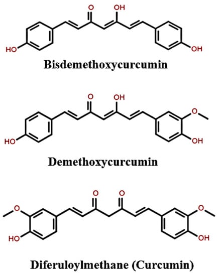 Chemical structures of bisdemethoxycurcumin, demethoxycurcumin, and diferuloylmethane (curcumin). Drawn using ChemSpider and available online: http://www.chemspider.com/Chemical-Structure.1906.html (accessed on 30 May 2021).