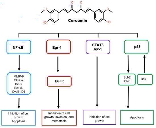 Curcumin is one of turmeric’s most active therapeutic agents due to its biological and pharmaceutical properties [95]. It can directly or indirectly bind to and deactivate various metals, proteins, receptors, growth factors, enzymes, and transcription factors. Direct targets include cell survival proteins, carrier proteins, protein kinases and reductases, metal ions, proteasomes, inflammatory molecules, and DNA methyltransferase 1. In contrast, indirect targets encompass proteins for cell survival, transcription factors, mediators of inflammation, enzymes, receptors growth factors, adhesion molecules, and cell cycle proteins [92].