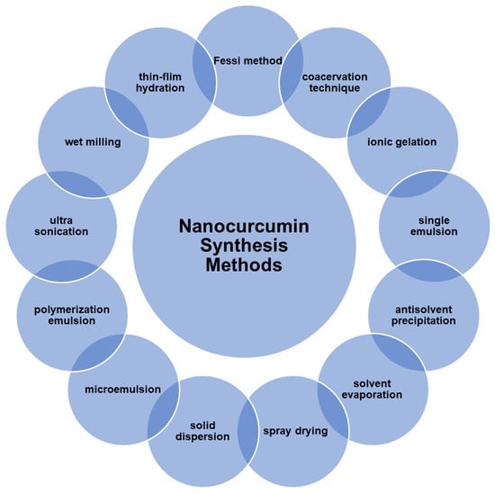 Nanocurcumin has been synthesized in various ways, including spray drying, emulsion polymerization, microemulsion, antisolvent precipitation, ultra-sonication, ionic gelation, single emulsion, solvent evaporation, wet milling, solid dispersion, thin film hydration, the Fessi method, and the coacervation technique (Figure 9). Each technique has its advantages and disadvantages, which have reviewed by many researchers [94,129,130].