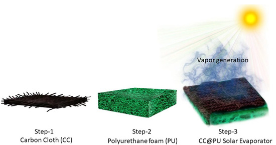 Herein, based on the excellent photothermal conversion potential and high thermal stability of CC, we report the facile fabrication of a solar-driven interfacial evaporation system composed of carbon-cloth-wrapped polyurethane foam (CC@PU) for clean water generation and seawater desalination, as illustrated in Figure 1. The CC@PU solar evaporator shows excellent light absorption (92%), excellent thermal management, and a high evaporation rate (1.71 kg m−2 h−1) under one solar intensity. The incorporation of hydrophilic PU foam with numerous open pores’ assembly endorsers a quick water supply with simultaneous thermal restriction to the downward matrix as the thermal conductivity of PU is even lower than CC, while the less thermal conduction of CC enables the thermal localization on the incident side of CC with no thermal passage on other side and achieves a surface temperature enhancement up to 67.37 °C under 1 kW m−2 providing it with highly desired conditions to build a highly efficient interfacial solar evaporator. Moreover, the solar evaporator shows excellent regenerating potential by redissolving the salt back into bulk water through the highly porous structure with excellent stability (15.24 kg m−2 mass change of water in consecutive 8 h operation under 1 kW m−2 solar irradiance) using seawater conditions. Furthermore, a slope-shaped glass condenser demonstrates the practical application of facile development of solar evaporation setup. Hence, the low-cost, facile-fabricated CC@PU-based interfacial solar evaporator shows promising potential for practical application in remote areas and opens up tremendous opportunities in solar water evaporation technology.