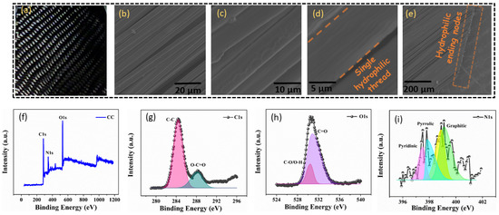 Morphological and chemical composition of black carbon cloth (CC). (a) Digital photo of CC. (b–e) FESEM images of the surface view of CC along with side-view nodes with different magnifications. Chemical composition of CC (f) full scan of XPS spectrum of CC along with elemental spectra (g) C1s (h) O1s (i) N1s spectra.