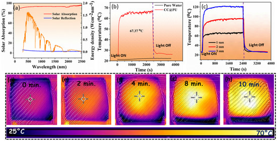 In order to develop any solar-driven desalination device, solar absorption and photothermal conversion efficiency are vital features that play a critical role in increasing the efficiency of an evaporating device [6,13,26]. To assess the solar absorption of the CC, ultraviolet-visible-near-infrared (UV-vis-NIR) spectroscopy was performed across the entire light range of 200–2500 nm. Surprisingly, the pitch-dark surface of the CC had 92% solar absorption with a minimum reflection as shown the Figure 4a. The results affirm that CC shows distinct broadband solar absorption with overlap in the solar spectrum and efficiently captures the incident light beams within the densely overlapped carbon fibers via light scattering and multiple internal reflections and absorption. This leads toward enhanced solar absorption with an enhanced energy conversion potential and paves the path for interfacial heat localization. This exceptional absorbing potential leads to an enhancement of the incident surface temperature. For this, the two systems were developed (CC@PU and water) and placed under simulated one-solar intensity to record the comparative surface temperature enhancement as a function of the irradiation time by a thermocouple sensor probe. The obtained results were dawn in the form of graphs as shown in Figure 4b.