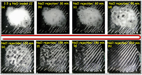 Many promising solutions are offered to cope with this issue, i.e., drilling millimeter channels in the wooden substrate and thin film evaporating structures, which sacrifice the photothermal area and lead to thermal leakage from the photothermal layer to the bulk water and suppresses the performance of the device [3,30]. Therefore, the self-regenerating potential of the as-prepared CC@PU interfacial solar evaporator was also checked against salt rejection in minimum record time to assess its reliability under extreme (high salt concentration) conditions, as shown in Figure 6a–h. For this, the CC@PU interfacial solar evaporation was placed in a 3.5 wt% NaCl solution and placed under 1 kW m−2 simulated intensity of solar simulator for several hours with an excess 3.5 g NaCl (enough to saturate the whole structure) and was spread on the interfacial photothermal layer to inspect the operational potential under extreme salt environment, as shown in Figure 6a.
