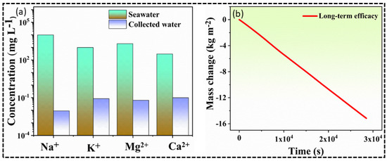 It is obvious that seawater contains a higher concentration of dissolved salts (3.5 wt%). Solar-driven seawater desalination is of great importance to desalinate seawater without electrical or mechanical energy [11]. Of note, many solar evaporators have been developed to desalinate seawater efficiently, unfortunately, all the parameters have not been achieved yet in a single solar evaporation structure [3]. The facile-fabricated CC@PU solar evaporator exhibited efficient solar-to-vapor conversion efficiency and simultaneously rejects salt for effective and long-term freshwater generation. The purity check of condensed water and stimulated seawater (3.5 wt%) was examined via the Inductively Coupled Plasma Optical Emission Spectroscopy (ICP-OES), as demonstrated in Figure 7a. CC@PU solar evaporator has a high potential to efficiently purify saline water. According to ICP-OES examination, condensed water has a lower concentration of salt ions especially Na+, K+, Ca2+, and Mg2+ which are essential to obtain standard drinking water as compared to higher concentrated stimulated seawater. The purified water by CC@PU solar evaporator perfectly rejects the elevated ions concentration level and the quality of the produced fresh water perfectly meets the standard of drinking water set by the World Health Organization (WHO) [11].