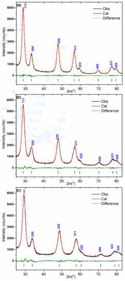 XRD patterns fitted using the Rietveld refinement method for Ce0.9Zr0.1O2 (a), Ce0.75Zr0.25O2 (b), and Ce0.5Zr0.5O2 (c) mixed oxides.