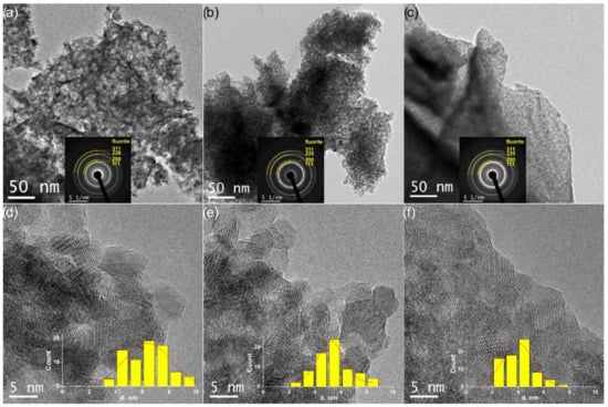 TEM data for Ce0.9Zr0.1O2 (a,d), Ce0.75Zr0.25O2 (b,e), and Ce0.5Zr0.5O2 (c,f) catalysts: (a–c) TEM images and SAED patterns in insets with indication of fluorite phase rings; (d–f) HRTEM images and particle size distribution histograms.