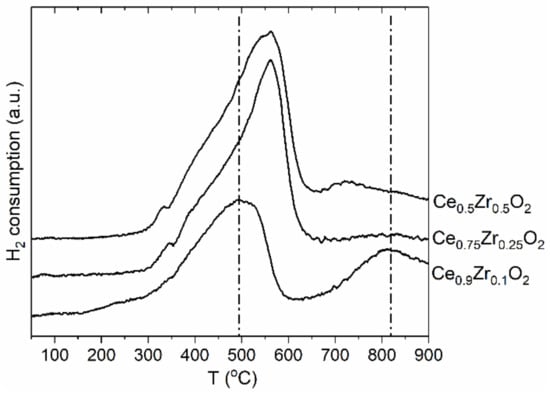 The reduction behavior of the Ce1−xZrxO2 oxides was studied. The H2-TPR profiles are reported in Figure 3. The H2-TPR profile of the low-doped Ce0.9Zr0.1O2 oxide exhibits two broad peaks at 500 °C and 820 °C. Such a two-peak pattern is characteristic of CeO2 oxide and reflects the stepwise reduction in the surface and bulk [50,51]. The TPR profiles of the Ce0.75Zr0.25O2 and Ce0.5Zr0.5O2 oxides exhibit asymmetric peaks with significantly increased intensities. The second high-temperature reduction peak is not observed. These data indicate that surface and bulk reduction processes occur almost simultaneously. The observed intensive asymmetric peak reflects the co-reduction in surface and bulk. This suggests the improvement of the reducibility of the mixed Ce1−xZrxO2 oxides with an increase in Zr content in full agreement with previous TPR studies of Ce1−xZrxO2 oxides [28,29,30].