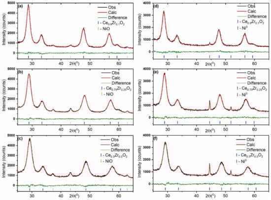 Fragments of XRD patterns fitted using the Rietveld refinement method for Ni/Ce0.9Zr0.1O2 (a,d), Ni/Ce0.75Zr0.25O2 (b,e), and Ni/Ce0.5Zr0.5O2 (c,f) catalysts before (a–c) and after (d–f) the catalytic reaction.
