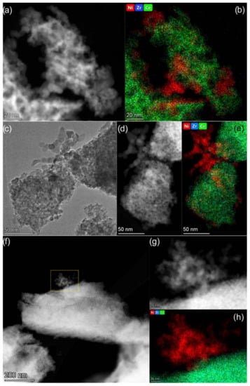 TEM data for Ni/Ce0.9Zr0.1O2 (a,b), Ni/Ce0.75Zr0.25O2 (c–e), and Ni/Ce0.5Zr0.5O2 (f–h) catalysts: TEM (c) and HAADF STEM (a,d,f,g) images and corresponding EDX mapping patterns (b,e,h) showing distribution of Ni (red), Zr (blue), and Ce (green). The maps are presented in background-corrected intensities.
