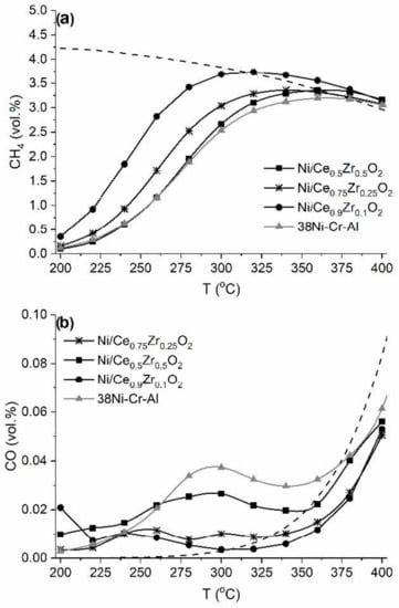 Temperature dependences of the outlet concentrations of CH4 (a) and CO (b) during CO2 methanation over the Ni/Ce1−xZrxO2 catalysts and 38Ni-Cr-Al catalyst. The dashed lines correspond to the calculated equilibrium concentrations.