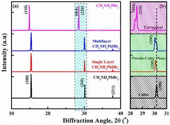 XRD analysis for CH3NH3PbI3 thinfilm, (top), CH3NH3PbIBr2 (single-layer thinfilm), CH3NH3PbIBr2 (multilayer thinfilm) and CH3NH3PbBr3 thinfilm (bottom) are demonstrated in Figure 1a, measured at room temperature. All the samples have maintained the pure perovskite phases. In the XRD measurements of the perovskite thinfilms, sharp intensity peaks at 14.5°, and 28.5°, are associated with (110) and (220) diffractions of CH3NH3PbI3 (top) confirming the perovskite structure for halide material. Two hump-like peaks located at 28.2° and 28.5°, are assigned to the (004) and (220) lattice planes for the tetragonal I4/mcm phase [9,18]. Meanwhile, CH3NH3PbBr3 thinfilm (bottom), CH3NH3PbIBr2 (single-layer thinfilm) and CH3NH3PbIBr2 (multilayer thinfilm) are crystalized and indexed in a cubic structure with a space group symmetry. Sharp intensity peaks at 14.9°, 30.16° and 37.8° are associated with (100), (200) and (211) lattice planes of the cubic structure [19]. Herein, it is noticeable that for CH3NH3PbIBr2 (single-layer thinfilm) and CH3NH3PbIBr2 (multilayer thinfilm), all the intensity peaks display obvious shoulders, where diffraction peaks of both samples are symmetrical with the domination of the cubic phase. The tetragonal phase of the pure CH3NH3PbI3 thinfilm is basically a transition from the cubic phase by the slight rotation of PbI6 octahedra along the (001) axis on the (001) plane while retaining their corner-sharing connectivity; that is why the mix halides can be designated by a pseudo-cubic lattice [20]. Preferably, the perovskite materials possess cubic symmetry, but whenever they are transformed to pseudo-cubic or distorted cubic symmetry, either due to the grain size or to mixing the halides, this variation in the structure brings substantial variations in the properties of perovskite [21].