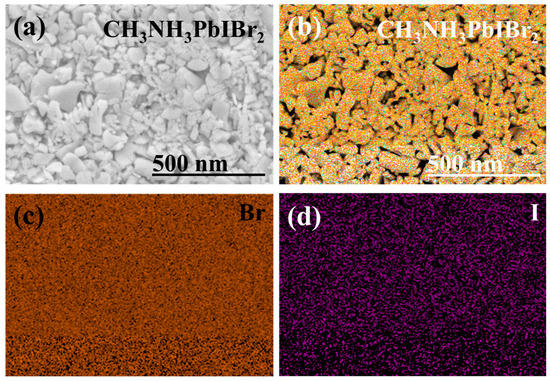 Herein, the cross-section SEM images of single-layer CH3NH3PbIBr2 thinfilm and multilayered CH3NH3PbIBr2 thinfilm are illustrated. The overall single-layer thinfilm thickness is ~340 nm, consisting of a pseudo-cubic CH3NH3PbIBr2 layer of ~95 nm, which is superimposed between the Ag (bottom 63 nm and top 65 nm electrodes) layers. Similarly, the thickness of the multilayered CH3NH3PbIBr2 thin film is ~585 nm with the average same thickness size (~88 nm) of the perovskite layers. For the elemental analysis and the elemental distribution of the dual halide (Br, I), constituents of the multilayer CH3NH3PbIBr2 thinfilm surface FE-SEM analysis are taken and illustrated in Figure 3. Figure 3a is the SEM surface image of CH3NH3PbIBr2 layer; the layer shows a loose and porous structure. Two dimensional elemental mappings of the surface states that Br and I elements possess the higher degree of dispersion and uniformity throughout the surface (Figure 3b–d).
