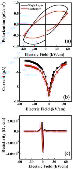 Ferroelectric (P-E) loops of Ag/CH3NH3PbIBr2/Ag, single-layer and multilayer thinfilms grown on glass substrate are presented in Figure 4a, measured at 50 °C under the frequency of 10 Hz. Both the films have shown a leaky capacitor characteristic, which might be due to the presence of defects and high porosity (discussed in SEM analysis) in thinfilms which create percolation paths for the current. It is reported that the ferroelectric behavior in the tetragonal phased CH3NH3PbI3 propagates due to the ionic polarization by the off-center shift of Pb in the PbI6 octahedral [22], which plays a vital role to establish the hysteresis in the dual halide peovskite materials, i.e., CH3NH3PbIBr2. Herein, weak ferroelectric performance is observed in the Ag/CH3NH3PbIBr2/Ag single-layer and multilayer thinfilms, but these are improved results as compared to previous reports. Leakage current plays a vital role on the ferroelectric properties of the material. Figure 4b presents the leakage current versus electric field plots of CH3NH3PbIBr2 single phase and multiphase thinfilms, measured at 50 °C. A leakage current value of ~4.83 × 10−6 A has been detected for the single-layer Ag/CH3NH3PbIBr2/Ag thinfilm at the electric field of ~50 kV/cm. The value increased to 5.06 × 10−6 A for the multilayered thinfilm at the same applied electric field. Moreover, in multilayer films, the particle size increased due to reduced lattice mismatching. This increment in particle size reduces the grain boundaries that produce better electron mobility in the multilayer thinfilms. The number of extra Ag electrode layers in the multilayered thinfilms is another reason for this increment in the leakage current. In addition, both of them exhibited ohmic contact with Ag as there was no rectification on the contact region. Hence, they did not show diode-like behavior. Figure 4c is the resistivity versus electric field plots of CH3NH3PbIBr2 single phase and multiphase thinfilms. Single layer Ag/CH3NH3PbIBr2/Ag thinfilm presented a high resistivity of 1.87 × 106 Ω.cm at the applied electric field of ~50 kV/cm, and resistivity reduced for the multilayered thinfilm to 1.60 × 106 Ω.cm, as was expected after following the trends of ferroelectric and leakage current plots.