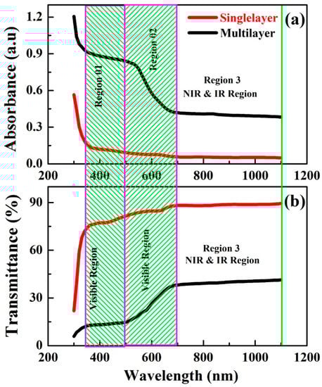 Figure 5a shows the absorbance spectra for the wavelength range of 300–1100 nm measured at room temperature. Samples showed two different trends for the absorbance spectra. Both films showed a decreasing trend of absorbance in the visible region (350–700 nm), whereas the absorbance becomes lower for the infrared/near infrared (IR/NIR) region; this decrease is due to lower production of excitation at the bandgap by the energy of both samples. Furthermore, multilayered perovskite film showed the maximum absorbance in the wavelength range of 300–450 nm and then showed it reduced for the wavelength range of 450–650 nm. Hence, it shows that for region 1, more absorbance is achieved as compared to region 2, and later it decreased further with the increase in wavelength 650–1100 nm in the IR/NIR region 3. The absorbance behavior of multilayered perovskite thinfilm produces the maximum quantum efficiency as compared to single-layer. Figure 5b shows the transmittance spectra for the wavelength range 300–1100 nm measured at room temperature. In IR/NIR region (650 nm to 1050 nm), the curve obtained for single-layered thinfilm depicted 90% of the maximum transmittance of light. However, in the visible region of light, the sample shows 80–85% transmittance with sharp absorbance. In contrast, the multilayered (CH3NH3PbIBr2) thinfilm shows 45% of light transmittance in the IR/NIR region, which varies from 650 nm–1050 nm. On the other hand, in the visible region starting from 350 nm to 650 nm, it transmits 15–20% of the light. Hence, transmittance of light in both samples increases with increasing wavelength and decreasing energy, because the energy of incoming photons does not produce excitations across the band gap. Single-layered perovskite thinfilm exhibits maximum transmittance as compared to multilayered thinfilm because of its minimum thickness.