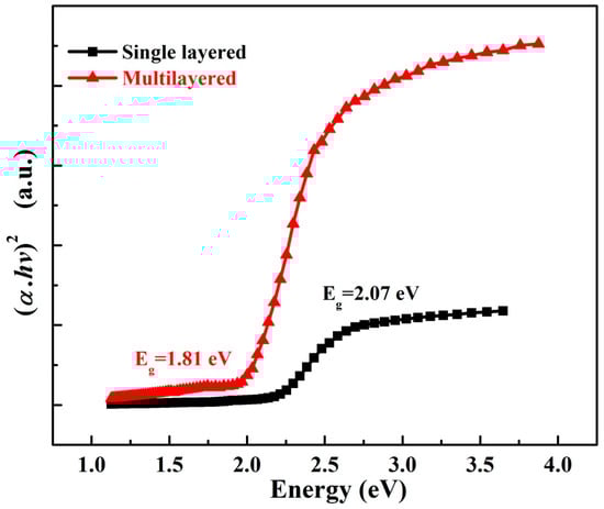 Figure 6 is the plot measured by Tauc plot method which is widely implemented for the determination of the bandgap value of the materials. Herein, bandgaps of single-layered and multilayered CH3NH3PbIBr2 thinfilms are calculated.