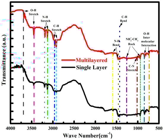 FTIR spectra for single-layer and multilayer CH3NH3PbIBr2 thinfilms.