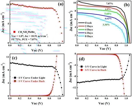 (a) Characteristic current–voltage (J-V) curve for photovoltaic cell based on CH3NH3PbIBr2 layer and its PV performance measured under AM 1.5G condition, (b) the stability (J-V curves) of perovskite solar cell based on CH3NH3PbIBr2 absorber material for 8 days, (c,d) the J-V curve behaviors in light and dark.
